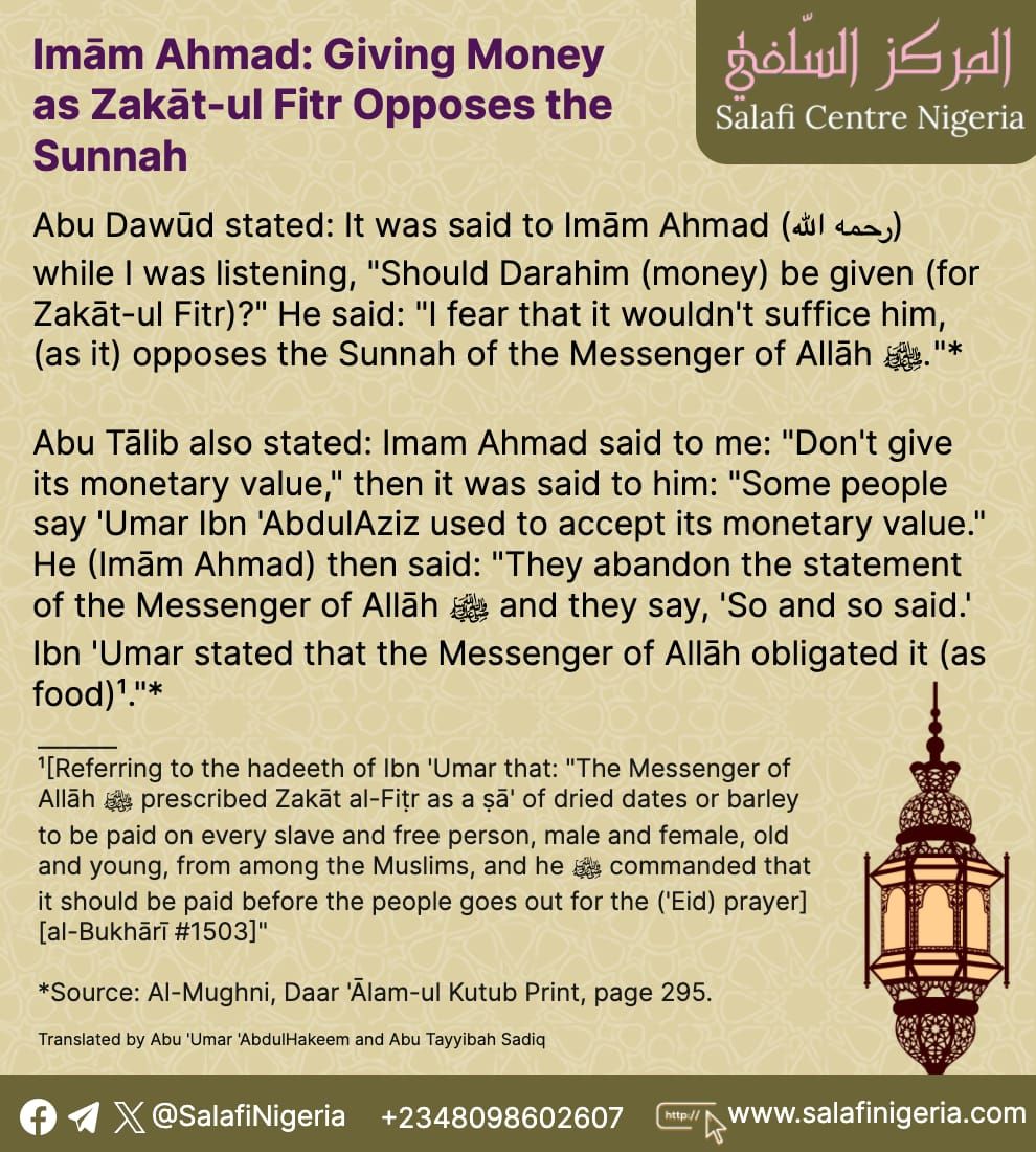 Imām Ahmad: Giving Money as Zakāt-ul Fitr Opposes the Sunnah